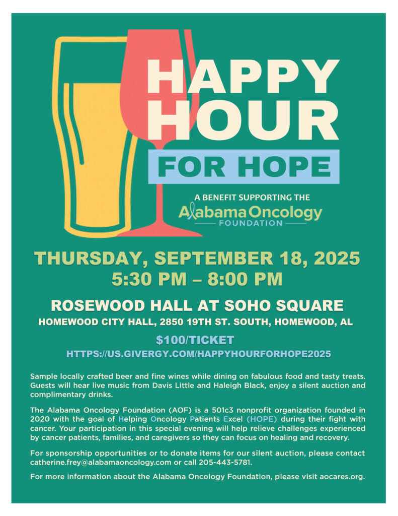 The Alabama Oncology Foundation will host its first Happy Hour for HOPE event. The special evening will feature tastings of fine wines and locally crafted beers, music by duo Davis Little and Haleigh Black, complimentary cocktails, fabulous food and a silent auction.
